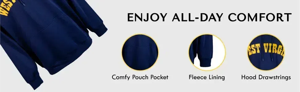 Show your undying love for your team with our West Virginia University Sweatshirt, whether cheering in the stands or simply going about your day-to-day. Our hooded sweatshirt features bold colors and clear professional graphics that will make your school’s name pop. This cozy fleece hoodie is made from 52% cotton and 48% polyester. Equipped with a cozy 9-ounce fleece lining, comfy pocket pouches, and hood drawstrings, this blue hoodie also boasts a true-to-size fit and comes in multiple sizes ideal for both men and women.